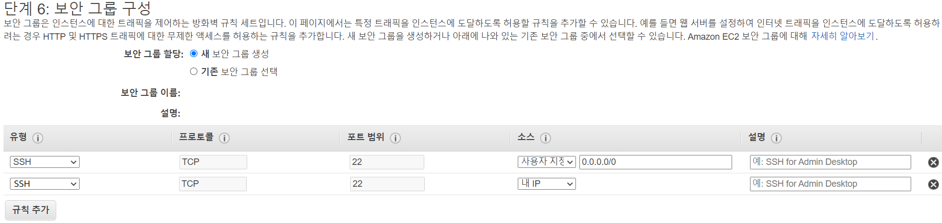SSH로 접속할 것이기 때문에 SSH유형으로 자신의 아이피를 보안그룹 구성에 추가한다.