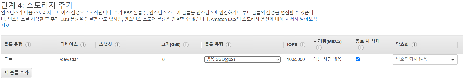 세부 정보 구성에서는 스토리지 용량, 보안그룹 구성 등을 할 수 있다. 자신이 사용할 용량을 적고 다음을 누른다.