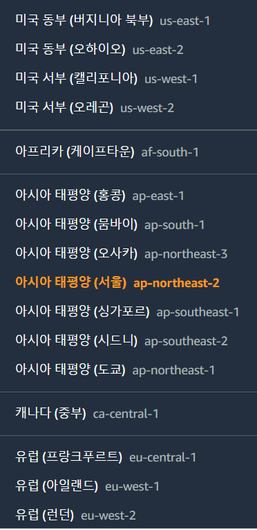 위와 같은 목록에서 아시아 태평양(서울) ap-northeast 를 누른다. 리전(Region)을 서울로 바꾸는 것으로, 서울리전을 사용하는 것이 다른 곳의 리전을 이용하는 것보다 속도가 빠르다.