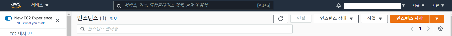 서울로 변경 후, 검색창에서 EC2를 찾고 들어간다. 위와 같은 창이 뜨면 인스턴스 시작을 누른다.