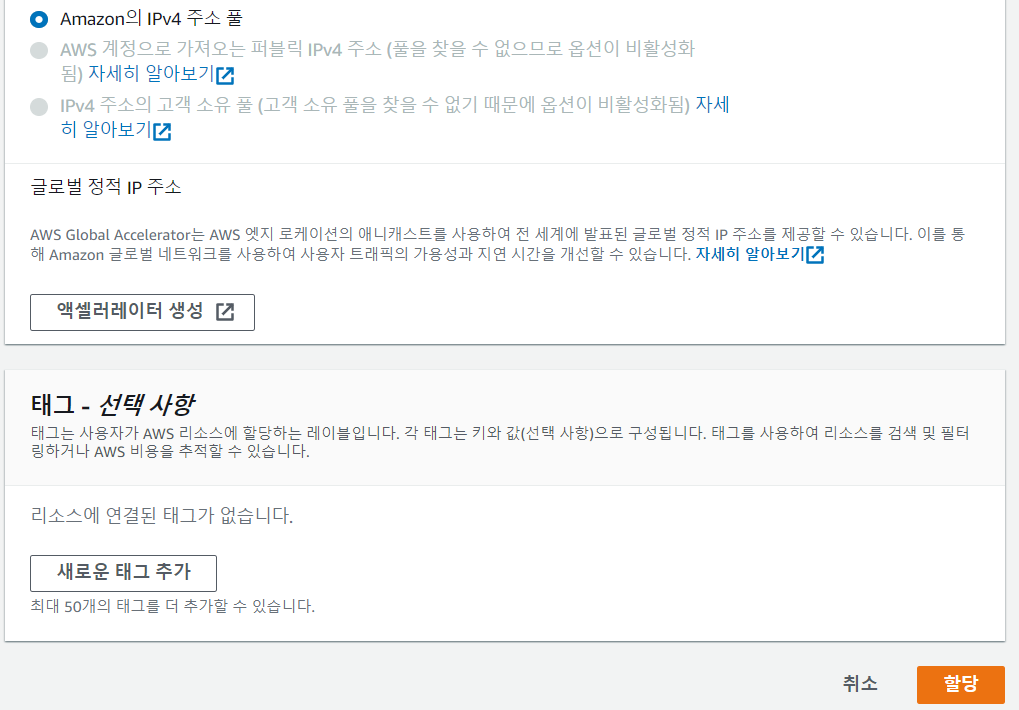 할당을 누른다. 그러면 Elastic IP주소 하나가 할당된다.