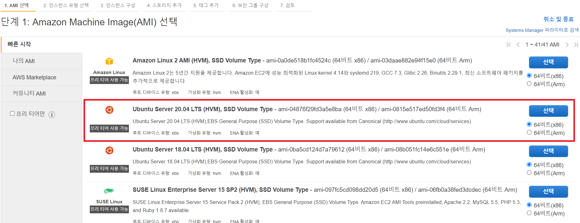 EC2 인스턴스에서 사용할 운영체제를 선택해야 한다.